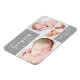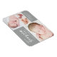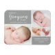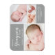 Simple y moderno anuncio de nacimiento para compartir las noticias de la llegada de su bebé. El frente gris presenta un collage de 4 fotos con el nombre del bebé en un alfabeto blanco moderno. Todos los demás detalles clave incluyendo fecha de nacimiento, estadísticas de nacimiento, nombres de padres están en una simple tipografía blanca.