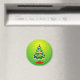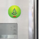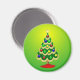 Pequeño imán de árbol de Navidad. El árbol está decorado con adornos de balón de vidrio brillante y guirnaldas de cuero cabelludo dorado y una estrella de oro encima.
