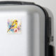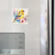 Este imán presenta obra de arte de acuarela de un pájaro cantor amarillo rodeado de flores botánicas suaves en tonos rosa, verde azulado y púrpura.