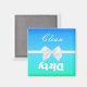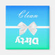 Un imán elegante perfecto para cualquier cocina. Tiene un azul bonito que se gradúa en un color verde. Un gráfico de una cinta blanca y un arco recorre el centro. Usa el lavavajillas para que todos sepan si los platos están limpios o sucios.