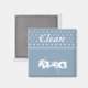 Este imán de bonito tiene un fondo azul. La parte superior tiene un diseño geométrico en el fondo y dice limpio. En el fondo es un fondo azul sólido y dice sucio. Usa el lavavajillas para que todos sepan si los platos están limpios o sucios.