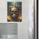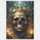Esta obra de arte cuenta con un cráneo ornamentado con una corona regal, intrincadamente entrelazada con viñas exuberantes y flores vibrantes. Las velas parpadeantes agregan un resplandor místico, proyectando sombras dinámicas que dan vida a la escena. Todo esto se encuentra en un entorno forestal sereno, creando un sorprendente equilibrio entre belleza y misterio.