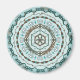 Esta mandala de círculo concéntrico presenta capas de motivos blancos, turquesa y marrones inspirados en las tejas celtas y la henna india, como las viñas, las cintas y las flores de loto.
