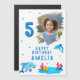 Tarjeta de imán de cumpleaños con foto de animales marinos delfines lindos. Delfines sonrientes lindos en estilo de dibujos animados. La foto está en un marco de pinceladas. Agrega tu foto y personaliza el texto en la tarjeta. Tarjeta de cumpleaños divertida y linda para la celebración de una niña o un niño.