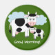 Un bonito imán de frigorífico que muestra a una vaca madre y su ternera junto con el texto "¡Buenos días!". Este producto se puede personalizar cambiando el color de fondo y/o el texto.