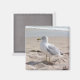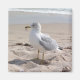 Un imán creado a partir de una fotografía de una gaviota de Florida posa en la arena de la playa mientras las olas entran tranquilamente.