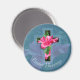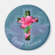 Imán redondo de las impresionantes Bendiciones de Pascua con hermosas flores rosadas de Hibiscus superpuestas con cruz de borde azul con tonos tropicales. También puedes disfrutar de los muchos diseños cristianos de la cruz de hibiscos disponibles en mi tienda. Fotografía original y diseño de Anura Design Studio.