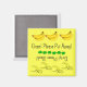 El imán del lavavajillas tiene una hilera de cáscaras de plátano con las palabras "¡Sucio! ¡Por favor, lava!" en un borde, y dímelo y tiene una hilera de bananos limpios y frescos con las palabras "¡Limpia! ¡Por favor, aléjate!" en el borde opuesto. Tiene una fila de hojas en el medio como divisor. El fondo es un patrón de cuadros muy pequeño en amarillo y blanco.