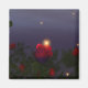 Al atardecer de una noche de verano, las luciérnagas flotan y brillan sobre un rosa jardín lleno de rosales rojas vibrantes.
