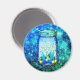 Un tarro de albañil de luciérnagas brillantes o bichos relámpago con un fondo nocturno estrellado. Un elegante diseño rústico rural. En colores azules, verdes y amarillos.