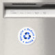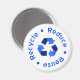 Imán blanco con símbolo de reciclado y Reducir - Reutilizar - Reciclar con letras azules.