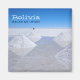 Imán fotográfico de recuerdo de montones secos de sal con reflexión en el agua esperando la cosecha en las salinas de Salar los Uyuni en el sur de Bolivia con el texto: 'Bolivia, Salar de Uyuni'.