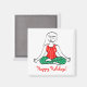 Imanes y regalos de yoga para Navidades y vacaciones. Foto de una mujer en una pose de yoga sentada con Navidades vestidos con motivos rojos y verdes. Añadir texto para personalizar estos productos de yoga de vacaciones.