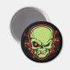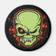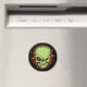 El cráneo verde monstruo con colmillos amarillos y una cruz roja en su malvado ojo. Con un contorno rojo y salpicaduras. Camisetas, caramelos, cartas, regalos.