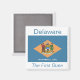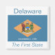 Una auténtica imagen de calidad superior de la bandera de Delaware establecida entre el nombre de estado y el apodo sobre un fondo de color de la bandera.