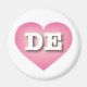 Este imán tiene un corazón tranquilo y fresco de color rosa con un centro blanco lavado que contiene las letras negrita blanca superior del funda DE, la abreviatura oficial del estado de Delaware, el primer estado.