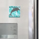 Un hermoso delfín acuarela con fondo azul y borde de onda negra.