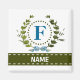 Una delicada corona de hiedra con un lazo a rayas azules está superpuesta sobre un fondo blanco fresco. El diseño apropiado para la boda presenta el monograma "F" en azul. El imán se puede personalizar con cualquier nombre sobre la cinta verde. Consejo de diseño: para la fuente que se muestra aquí, use mayúsculas para el nombre.