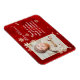 Una hermosa tarjeta veteada roja con un marco de foto rodeado de copos de nieve blancos y bronce.
