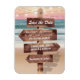 Imanes para guardar la fecha de boda en el océano romántico con una playa de arena con puesta de sol exuberante, luces centelleantes y su texto escrito en un letrero de madera rústica.