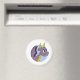 Magnet con ilustracion de cabeza de un lindo dragón volador morado en círculo azul, cuento de hadas / diseño de fantasía para niños por Maxi Harmony