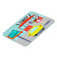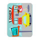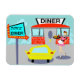 Sirva algo especial con este imán Diner Flexi de los años 50. El diseño de los dibujos personalizados incluye un edificio de ladrillo rojo con ventanas azules, puertas dobles grises y un cartel blanco que dice "Diner" colgado en el techo. En el estacionamiento, hay una segunda señal en un poste. El cartel tiene un fondo turquesa y una flecha roja que apunta a "Don's Diner". El cartel ha hecho su trabajo porque hay un auto amarillo brillante con las aletas aparcadas al lado. A pesar de que no podemos verlos, los pasajeros del auto deben estar golpeándose los labios. Un monótono y joven carhop está patinando patinaje sobre ruedas en su camino al auto. Su pelo de morena está en una cola de poniente hinchable. Lleva un uniforme corto y rosado con guarnecido negro y delantal blanco. Equilibrado por un lado, el carrito lleva una bandeja negra con una hamburguesa gigante y una refrescante y anticuada botella de refresco. El fondo de la sala está verde azulado de nubes azul claro y de siluetas de cedros.
