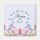 Hermosa cita cristiana que combina "Dios bendiga nuestro hogar con amor paz y alegría" con flores silvestres y mariposas florales. Excelente como cita de aliento en la cocina o en cualquier otra habitación.