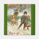 Imagen vintage de un saludo escandinavo. Niños y chicas caminando por la nieve con su árbol de Navidad y jalando a su hermanita en un trineo. Pequeña imagen sobre productos de regalo limitados.