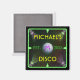 Crea tu propio imán de refrigerador cuadrado de bar-discoteca personalizado de los años 1970 usando esta plantilla. El imán tiene un borde de neón verde con cuatro focos que brillan sobre una bola de espejo de espejos plateada / bola de purpurina. El fondo negro tiene un débil arco iris de cuadrados coloridos. Este imán funky se puede personalizar con tu nombre o apellido, monograma, y el año en que se estableció tu bar o la cueva masculina con temas de los años 70 u 80. Simplemente rellene la plantilla DIY fácil o "Personalizar It" si desea cambiar el tamaño, reorganizar o cambiar los colores y tipos de letra del texto. Este imán es perfecto para tu decoración de estilo disco retro.