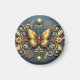 Representación artística de una mariposa dorada ornamentada rodeada de elegantes rizos florales y ornamentales sobre un fondo azul contrastante, realzando los temas del lujo, la elegancia y la decoración.
