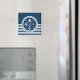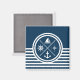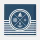 Diseño de temática náutica con símbolos náuticos (ancla, velero, velero, brújula) sobre fondo rayado blanco y azul marino.