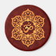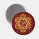 Un diseño de aluminio u Om se encuentra dentro de una flor de loto estilizada. El patrón circular está coloreado con un amarillo dorado que se resalta para crear un brillo luminoso en la superficie. El fondo está pintado de rojo profundo que se puede ver a través del espacio negativo de la flor. Una sombra aparece justo debajo del diseño, por lo que parece flotar justo encima de la superficie del imán. Este diseño elegante es una impresionante representación de este símbolo espiritual.
