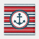 Diseño náutico con decoración de ancla en forma redonda sobre fondo rayado rojo, azul y blanco