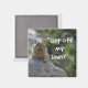 Divertida ardilla de aspecto enojado con el lema de meme de internet "Sal de mi césped" en un imán frigorífico.