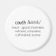 Funny Couth Humor Definition Magnet es perfecto para que tu oficina publique notas importantes. Me inspiré para crear este diseño porque mi madre siempre dijo este dicho cuando era niña. Cuando veía a alguien que no actuaba de manera apropiada, sofisticada o bien educada, decía: "¡No tienen boca!" El diseño de la tipografía tiene "boca: sustantivo, buenos modales, refinado, educado, cultivado, elegante" en una simple letra negra con fondo blanco personalizable.