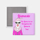 El imán Divertido de llamaste rosado es un lindo imán divertido que presenta a una graciosa Lady Llama vestida de rosa compartiendo sus pedazos de sabiduría en un imán cuadrado.