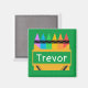 Un imán personalizado audaz y colorido para los niños es ideal para las salas de juegos y las zonas de estudio. El diseño cuenta con una caja de crayón dividida con espacio para personalizar con el nombre del niño en el centro, sobre el fondo verde.