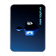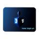 Un modernístico dreidel azul metálico contra un fondo oscuro y nocturno. Dos de las letras hebreas encontradas en un dreidel, una monja y un shin, brillan brillantemente. El texto en hebreo que dice "Chag Chanukkah Sameach" (Feliz Hanukkah) también aparece en azul y blanco resplandeciente.