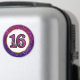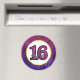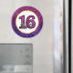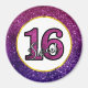 Elegante y elegante, dulce 16 imán. Diseñado con un fondo compuesto por piedras de piedra espumosa rosa y violeta de purpurina. Un marco de círculo con un borde falso de Relieve metalizado dorado en la parte superior con una tipografía de moda en el interior que dice dulce 16.