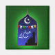 Eid Mubarak saluda al ilustracion con una escena nocturna festiva: una guirnalda colorida, la luna y las estrellas y una silueta de una mezquita expuesta en una ventana árabe sobre un fondo con motivos verdes.