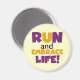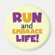 Si te gusta correr, correr 5 Ks, 10 Ks, media maratón, o maratones, te encantará este colorido diseño de texto en morado y amarillo que dice Correr y abrazar la vida! Corre y abraza camisetas de la vida, caramelos, imanes, botones, tarjetas, pegatinas, llaveros y muchos otros artículos para corredores que aman un diseño de ejecución brillante y colorido.