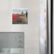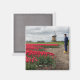 Imán fotográfico de recuerdo de un granjero con zapatos de madera amarillos que inspeccionan sus tulipanes rojos con un molino de viento tradicional en primavera en la región de las Bombillas en los Países Bajos.