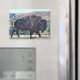 Un imponente boscoso americano, con su áspero abrigo y su potente postura, camina entre pintorescas planicies de hierba. El entorno de los alrededores realza la belleza salvaje de este emblemático animal norteamericano. Obra de arte de Sally Lannier/Dibujos de diseños de sueños pintados