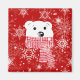 Rompecabezas de oso polar con una bufanda rojiza sobre un fondo rojo con copos de nieve blancos.