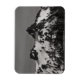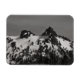 Fotografía en blanco y negro de dos picos en la cordillera de Tatoosh, conocida como El Castillo y El Pinnacle. La cordillera está cubierta de nieve a pesar de ser de verano. Hay árboles y piedras dispersas por el paisaje y las montañas. La posición del sol permite colocar sombras sobre la montaña. Las nubes incognitivas adornan el cielo. Derechos reservados ©2023 Kimberly J Tilley. zazzle.com/store/developingnature
