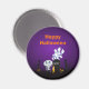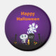 Un imán divertido espeluznante con un diseño de halloween adorable. Ubicado en un oscuro y temible cementerio. Una lápida dice QEPD, con una vela y algunos cráneos brillantes en el suelo. Una vieja valla inestable se inclina hacia un lado. Un adorable esqueleto sonriente está ondeando y algunos fantasmas de aspecto fresco están girando por el aire. Se establece sobre un fondo de gradiente negro y púrpura. El texto dice feliz halloween pero puede ser personalizado para decir lo que quieras.