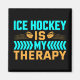 Imán temático de hockey con pollas de hockey y texto que dice Hockey sobre hielo es mi terapia!