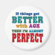 ¡Gracioso humor de cumpleaños "sobre la colina"! Si las cosas mejoran con la edad, ¡entonces soy casi perfecto! Un regalo de cumpleaños humorístico para cualquiera que se sienta un poco mayor. Personalízalo! Cambia los colores, agrega texto, cambia las cosas, personaliza para un regalo de cumpleaños perfecto!