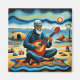 A.I. creó la impresión de un hombre barbudo con un gorra sentado en una alfombra colorida, tocando un instrumento de cuerda Bouzouki por una playa surrealista con patrones vibrantes y giratorios. El paisaje cuenta con formaciones rocosas inusuales, un sol brillante y un mar tranquilo.