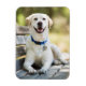 Un perro Labrador Recuperever amarillo sonríe mientras se sienta en un banco de madera al aire libre en un día soleado.